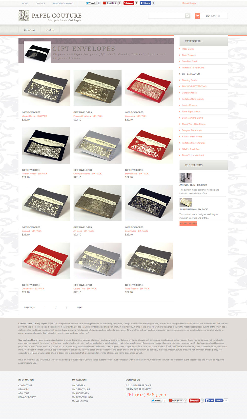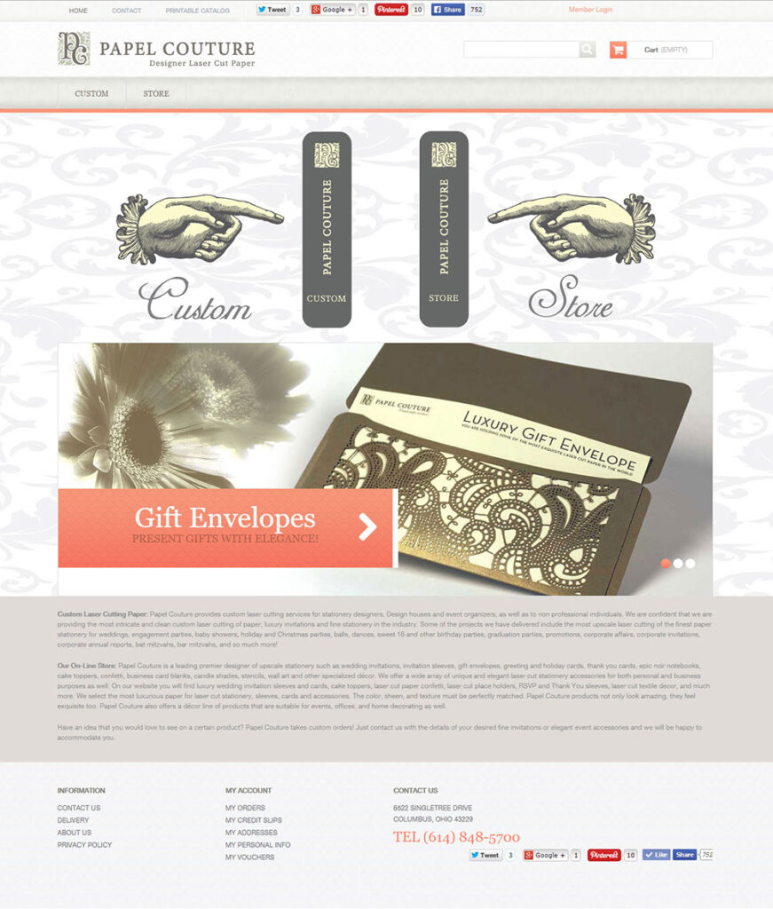 The Prestashop template was custom built to Papel Couture’s specifications, including a custom home page, custom product listing page, and enhanced social media components.